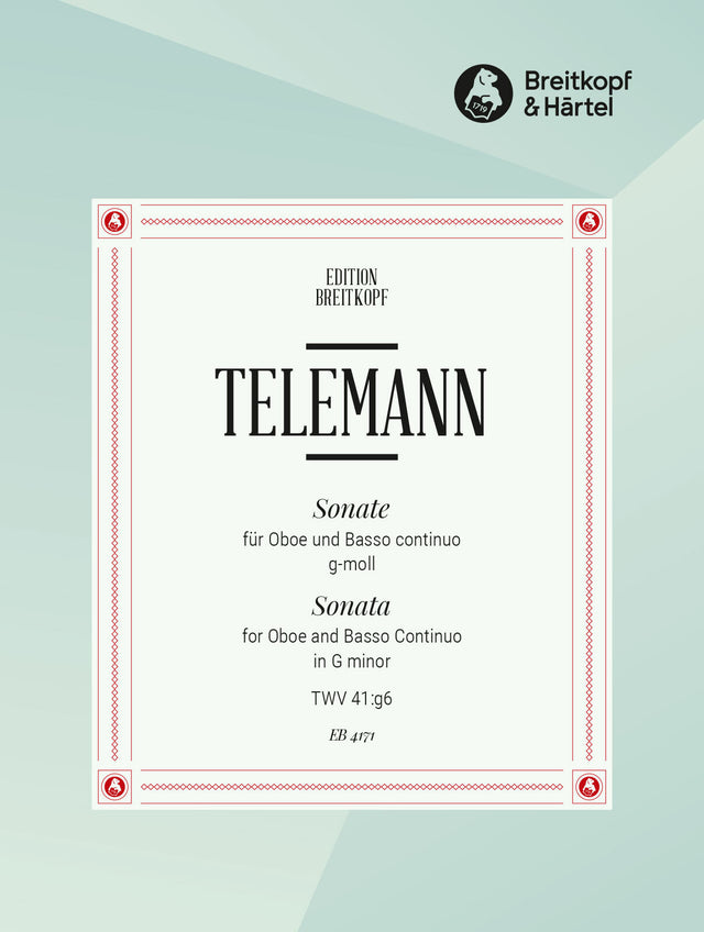 The five-movement Sonata in G Minor TWV 41:g6 by Georg Philipp Telemann was taken from Part III of the Tafelmusik. Ever since the publication of Volume 61/62 (1927) of the Denkmäler Deutscher Tonkunst , the work has belonged to the core stocks of Baroque oboe literature. The present edition is based on this publication, but the basso continuo numbering has been replaced by a realized keyboard part.