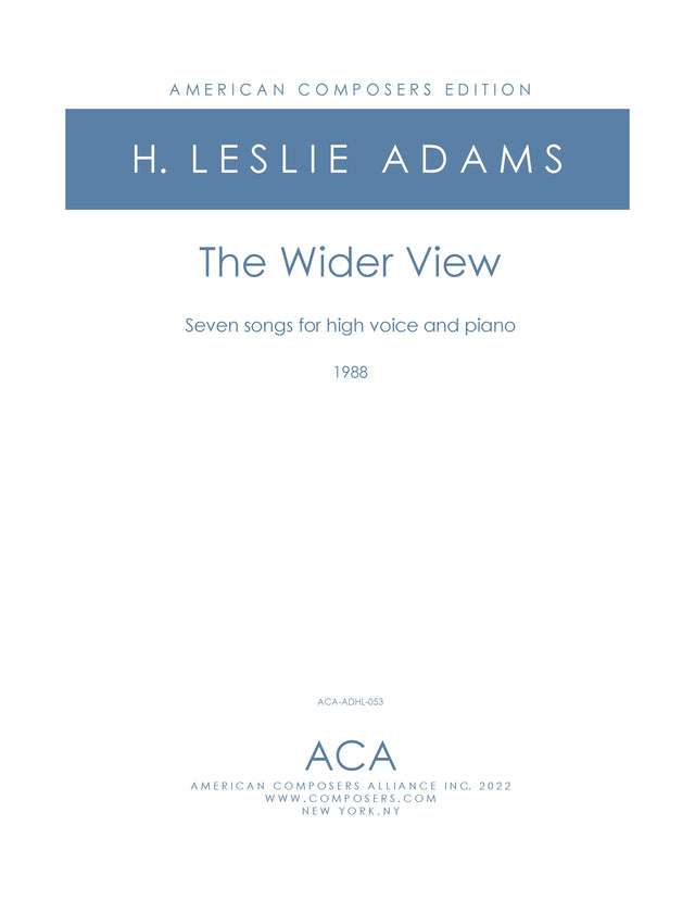 The Wider View is a panoramic portrait of human emotions, from songs of love and the blues to songs of nature and the human spirit. It seeks passion's source and its ability to be sustained. The journey begins with a need to fulfill an inner yearning, resulting in a search. That experience is depicted in Paul Laurence Dunbar's stirring verse, "To the Road!" Varying degrees of self-fulfillment reveal a need to pause and reflect which in turn evoke past memories and yearnings. This period of introspection is portrayed in Langston Hughes' dialectical "Homesick Blues." Continuing onward, relationships are created that are so magnified as to move beyond physical limitations. in "Li'l' Gal" and companion "My Man," Paul Laurence Dunbar employs vernacular verse, light-heartedly depicting affection between two people in an amorous relationship. Recognizing the broad spectrum of devotion, the journey turns to experiencing loss in Georgia Douglas Johnson's "Love Come and Gone." Such poignancy creates an unsettling question to the soul. A new horizon is identified in R. H. Grenville's "The Wider View." The learned, imitated and expressed nature of true tenderness emerges, coming from within and lasting forever. James Dillet Freeman's "Love Rejoices" summarizes the power of passion as a profound inner expression projected outward. At this point, the journey comes to an end on a note of celebration.