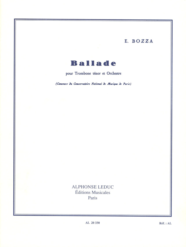 This piece was originally composed for conservatory students, displaying the technical skills as well as musicality of the soloist. There is no formal structure to Ballade, however, the many changes in tempo provide variety throughout. with no distinct musical theme unifying the music, it is interesting to note that much of the material of Bozza's Ballade is extracted from orchestral excerpts. Ballade is an ideal performance piece for advanced trombonists.