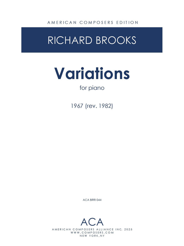 VARIATIONS FOR PIANO (1967; rev. 1982) is a student work composed when I began private study with a teacher. My teacher, Myron Fink, a brilliant musician and composer, identified some compositional "tricks" I tended to rely on. His assignment was to compose a set of variations for piano in which each variation was distinctly different from the others. Variations for Piano was the result. After making a few revisions I decided it was good enough to be seen. The Theme is followed by twelve variations, with the last being a four-voice fugue.