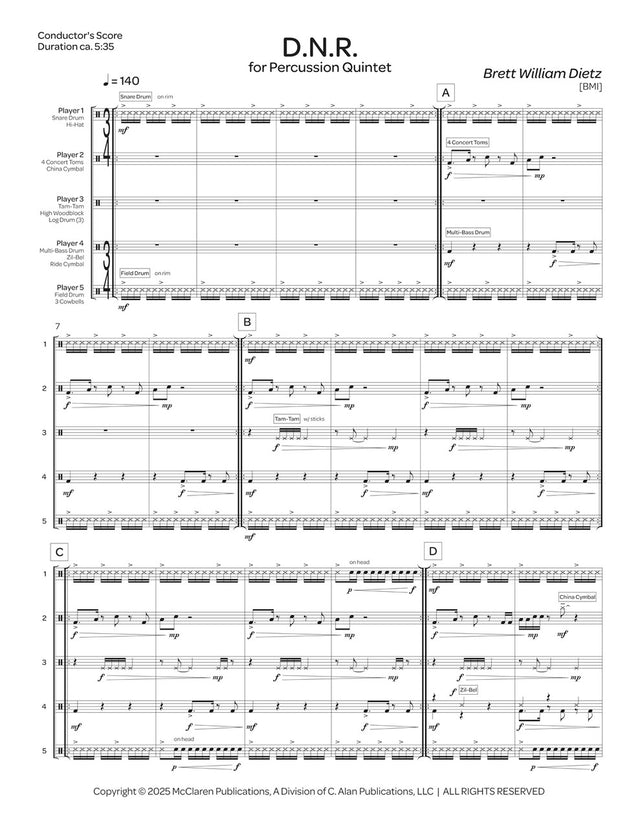D.N.R. , or "Do Not Resuscitate" is a legally recognized order signed by a physician at a patient's request. A D.N.R. means the patient does not want to be resuscitated if they suddenly go into cardiac arrest. The initial musical idea is a call and response between the tom toms and bass drum that sounds very similar to a heartbeat…or at least one with arrhythmia!