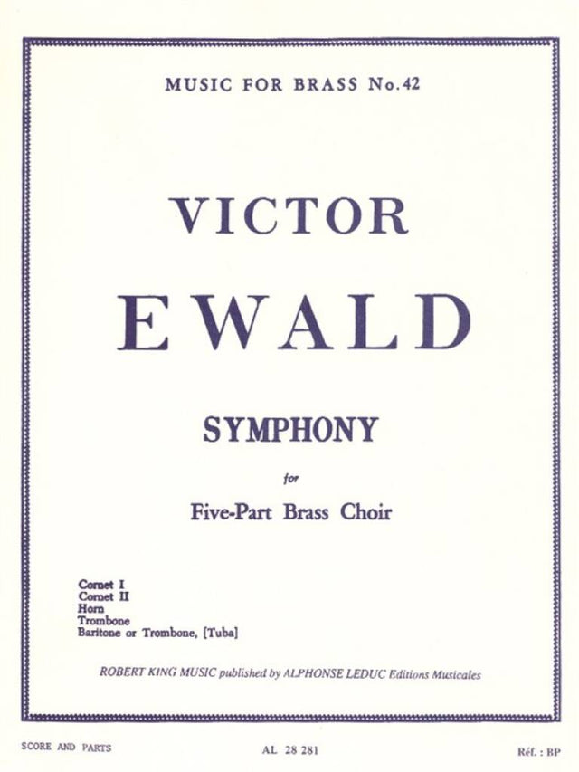 "Russian-born, Victor Ewald (1860-1935) mainly composed for brass instruments. His Symphony for 5-part Brass Choir, also known as his Brass Quintet, No. 1, Op. 5 remains among his greatest works. It is often thought that Ewald's four quintets are the first original pieces to be composed for the ensemble recognised today as the Brass Quintet. The first of these, Symphony, comprises three movements; 1) Moderato, 2) Adagio-Allegro-Adagio, and 3) Allegro Moderato. Including separate parts as well as a full score, this edition of Ewald's Symphony for 5-Part Brass Choir is not to be missed by aspiring brass ensembles."