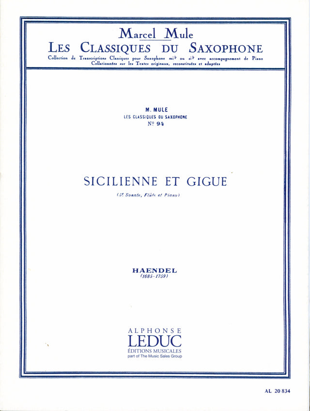 G.F.Handel (1685-1759) is considered one of the greatest composers to have ever lived. Therefore, when saxophonist Marcel Mule (1901-2001) arranged Sicilienne and Gigue for Saxophone, it was very well-received. The Sicilienne and Gigue comes from Handel's Flute Sonata No. 5 which was composed in 1732. The two movements arranged for Saxophone are contrasting and provide saxophonists with excellent baroque repertoire. Mule's transcriptions ensure that the Saxophone part is within the tessitura of the instrument and contains the necessary articulation, phrasing and breath marks. for all saxophonists, this Mule arrangement of Handel's Sicilienne and Gigue is essential.