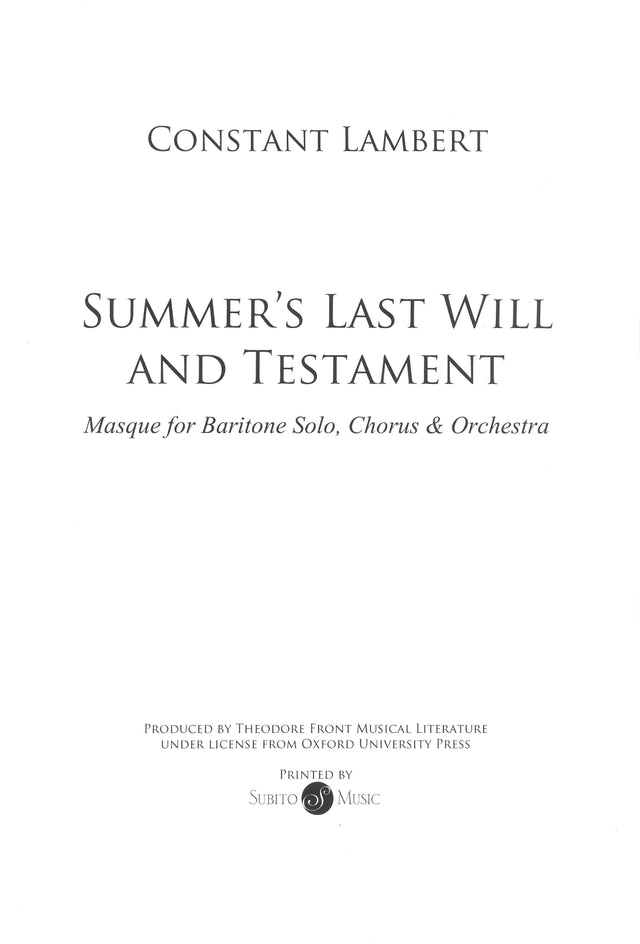 Summer's Last Will and Testament is a choral masque or cantata, written between 1932 and 1935, and premiered in 1936. It is scored for chorus and orchestra, with a baritone solo also featured in the last of its seven movements. It is based on the play of the same name by Thomas Nashe, written around 1592. Lambert considered the work his magnum opus and it is his largest work in any genre.