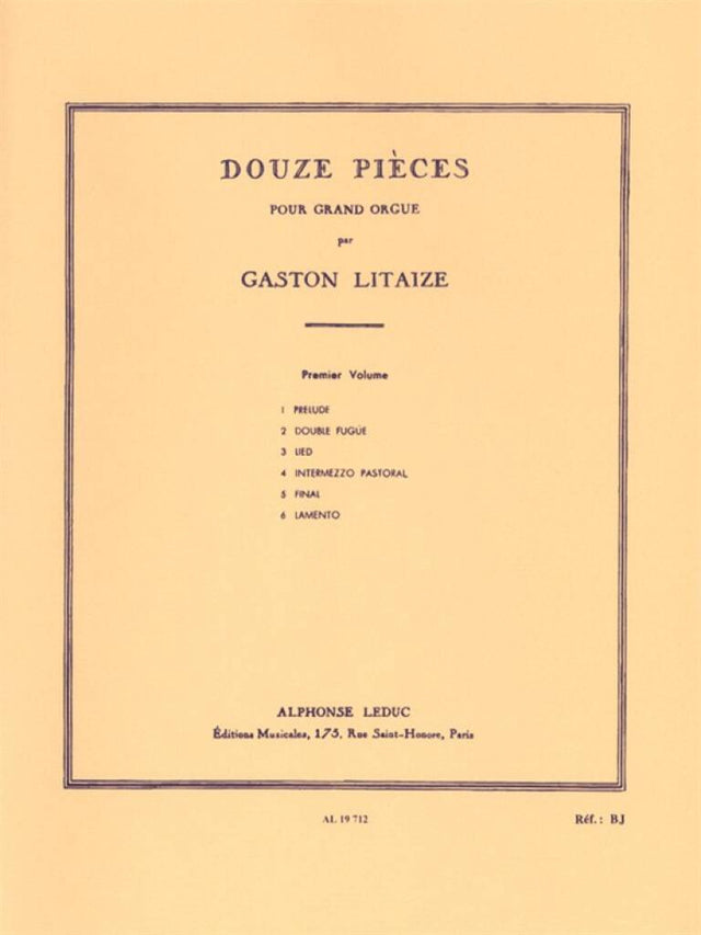 This first volume of Twelve Pieces by Gaston Litaize is a set of six pieces for organ. with a difficulty that would fit the skills of upper intermediate players, these pieces require the use of pedals. This first tome includes: 1. Prelude, dedicated to Lauret Bolli, his friend 2. Double Fugue 3. Lied, dedicated to Guy Lambert 4. Intermezzo Pastoral, dedicated to Miss Line Zilgien 5. Final, dedicated to his professor Marcel Dupré 6. Lamento, dedicated to his friend Maurice Dalphin. and the second tome consists of: 7. Scherzo 8. Toccata sur le veni creator 9. Priere 10. Jeux de rythmes 11. Interlude 12. Variations sur un Noël angevin. This piece is quite famous among Gaston Litaize's compositions. Gaston Litaize (1909-1991) was a French organist and composer, blind since his youth. Considered as one of the organ masters of his times, he toured and worked on many recordings. He was also a good professor, and composed many pieces for solo organ and for organ with other instruments.
