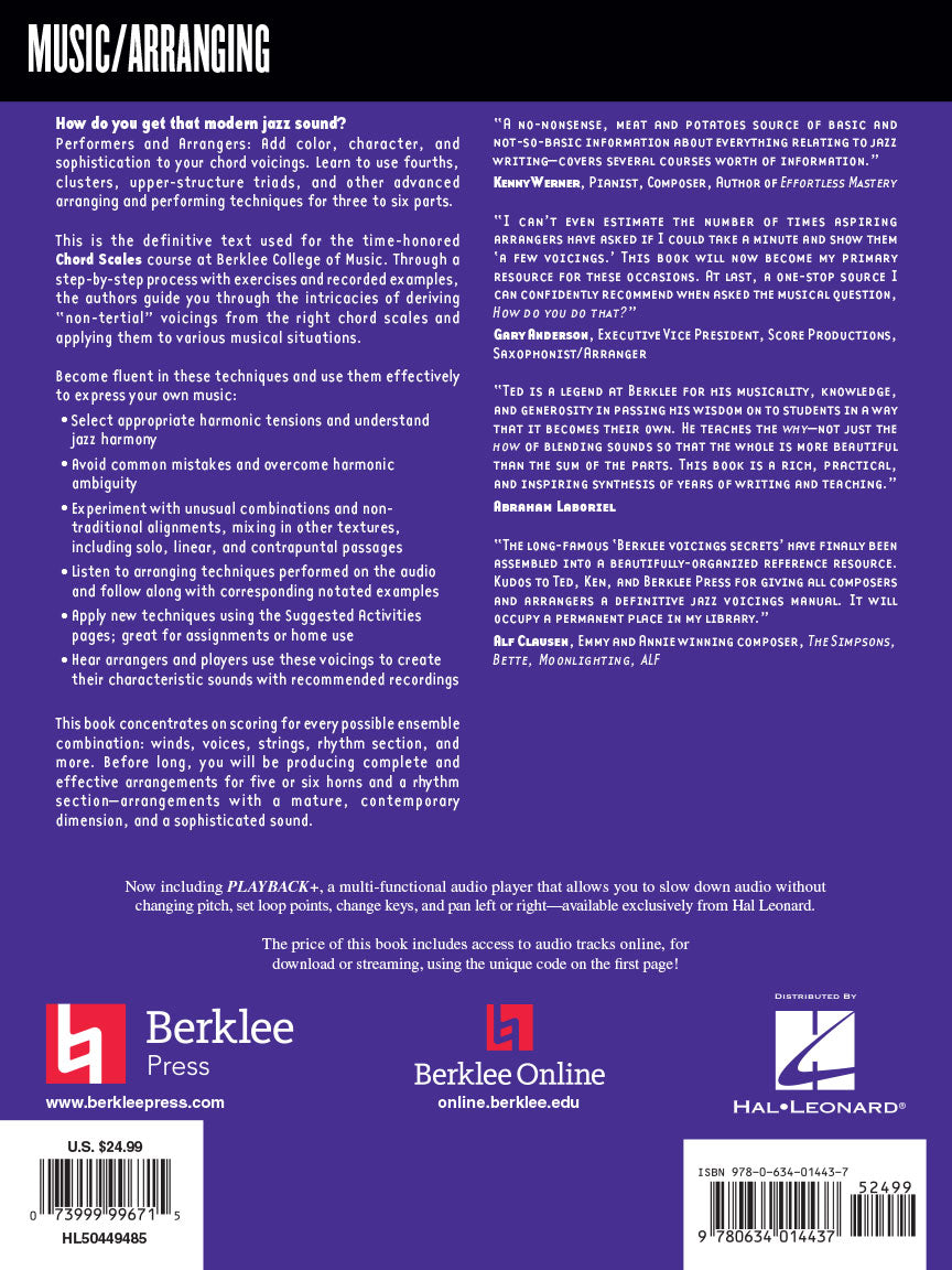 The definitive text used for the time-honored Chord Scales course at Berklee College of Music, this book concentrates on scoring for every possible ensemble combination and teaches performers and arrangers how to add color, character and sophistication to chord voicings. Topics covered include: selecting appropriate harmonic tensions, understanding jazz harmony, overcoming harmonic ambiguity, experimenting with unusual combinations and non-traditional alignments, and many more. The accompanying online audio includes performance examples of several different arranging techniques. The audio tracks feature PLAYBACK+, a multi-functional audio player that allows you to slow down audio without changing pitch, set loop points, change keys, and pan left or right.
