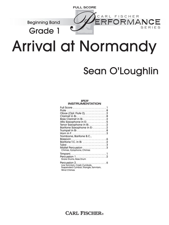 Arrival at Normandy depicts the entry into Normandy by our forces on D-Day. The tune uses only the first 6 notes learned in most band method and the most difficult rhythm is quarter note based in the winds. Perfect contest/festival showcase piece for a beginning band.