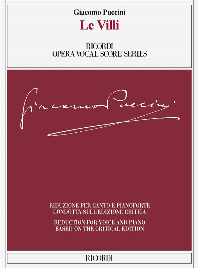 What is being presented here is the piano vocal score of Le Villi, Giacomo Puccini's first stage work, the full score of which was published by Casa Ricordi (NR 141755) in 2020.The premiere of Le Villi took place at the Teatro Regio in Turin on 27 December 1884, and was followed by a Milanese performance at Teatro alla Scala on 24 January 1885: both productions were quite well received by critics and public alike.The critical edition by Martin Deasy is based on the autograph score that Puccini initially prepared for the one-act version (Willis), and later modified for the two-act, revised version (Villi). Pursuing a groundbreaking philological approach, the editor has, furthermore, taken into proper consideration the contemporaneous printed editions of the piano vocal score, which constitute, in his view, the principal collateral sources, if one is to consider the particular genesis of this work. for it is certain that Puccini, upon entering the Sonzogno competition, submitted a score of Willis that lacked proper orchestration in a few pages and displayed, above all, incomplete vocal lines. However, he also provided a manuscript reduction for piano and vocal score (now lost, except for the final Number of Willis) that was undoubtedly more detailed, as far as the vocal lines were concerned. The editor demonstrates that the vocal material realized for the first performance of Willis was not derived from the autograph score, but from the lost score reduction. The latter also served as the basis for the preparation of Ricordi's printed edition of the piano vocal score.