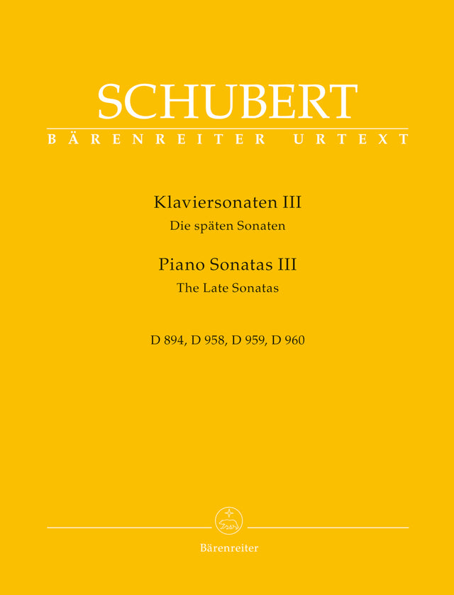 Volume 3 of Schubert's Piano Sonatas includes the tuneful, dance-like Sonata in G Major D 894 (1827), sometimes called the "Fantasie" sonata, as well as the three great sonatas in C Minor, A Major and B-flat Major (D 958, 959 and 960), which were conceived as a triptych and constitute the composer's greatest contribution to the piano sonata genre. The works pay homage to the three late sonatas of Beethoven. This scholarly-critical Urtext edition is based on the definitive musical text of the "New Schubert Edition" and presents the works in a spacious new engraving with practical page turns. It includes an informative Foreword and detailed notes (Ger/Eng) on central performance practice issues such as the use of pedals and Schubert's distinctive manner of notating accents. It is rounded off by a Critical Commentary (Eng) with performance-related alternative readings. Schubert's drafts for individual sonata movements can be accessed on the Bärenreiter website.