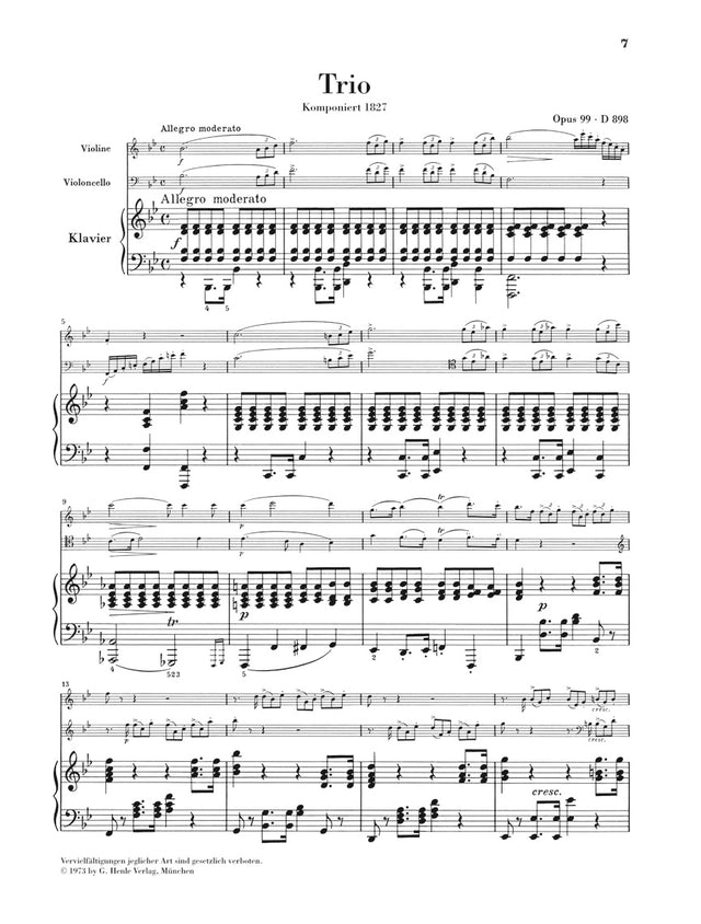 One needn't hesitate a second in assigning Schubert's two piano trios to his best works. Both were written no later than 1827, hence one year before the composer's death, and are typical works of his maturity: abounding in blissful melodies paired with formative power and profound depths of expressiveness. Whereas Schubert had sold the in E-flat Major Trio, Op. 100 D 929 to the Leipzig publisher Probst (it appeared just after Schubert's death, however), the B-flat Major Trio, Op. 99 D 898 did not make it to publication during Schubert's lifetime.The Adagio in E-flat Major, Op. posth. 148 D 897, which is reproduced in the Appendix and which has become known as Notturno, was most likely originally planned as the slow movement of the B-flat Major Trio. with its expressiveness ascending to darkest despair, Schubert possibly considered it as unsuited for publication. It was not published until 1846; in the Appendix of this volume one will find Schubert's first attempt in this genre, which he wrote at the age of 15 in summer 1812.