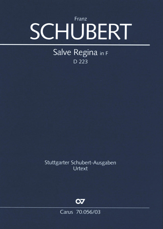 Ferdinand Schubert liked the Salve Regina in F (1815) so much that he asked his brother Franz to compose wind parts for it. The piece was published in 1825 in Vienna by Diabelli with winds instruments under the title "Zweytes Offertorium" and in 1888 it was included in this version in the old Schubert edition as well as in all other editions published since then. This Carus includes both versions and it is printed so they may be compared. This offers smaller ensembles an alternative to perform the work "without winds" and this version also has the added charm of being the original.