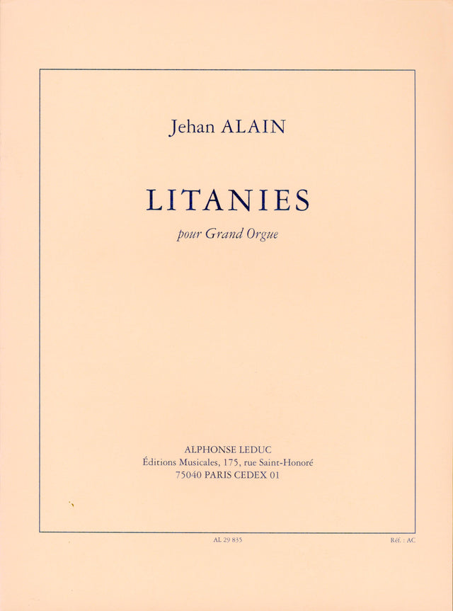 Jehan Alain (1911-1940) was a French organist and composer. His Litanies for Organ was composed in 1937 and is a sublime addition to the instrument's repertoire. Alain studied with Organ virtuosos, Guilmant and Vierne and was primarily an organist and composer of religious music. Whilst at the Paris Conservatoire, he won many prizes and his composition catalogue comprises some 140 works. Alain's Litanies is his most famous work and is prefaced with the text; "When, in its distress, the Christian soul can find no more words to invoke God's mercy, it repeats endlessly the same litany....for reason has reached its limit; only faith can take one further..." From lively and comical pieces, to sensitive and unexpected works, Alain's pieces are diverse in musicality. Moreover, the composer exploits Organ techniques, making Litanies an exciting and varied piece for advanced level organists.