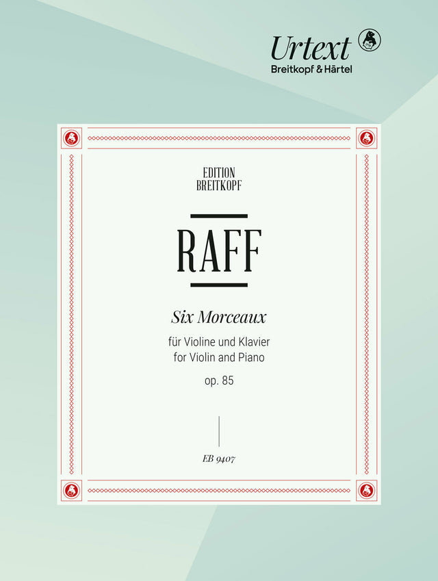 With his Six Morceaux , Raff created a collection of six short pieces with the aim of "pleasantly entertaining many a listener" and demonstrating that he was "also capable of writing something easy". After all, he had made a name for himself in the years before with extremely demanding chamber music for renowned dedicatees. The Six Morceaux , dedicated to the violinist Ludwig Straus, on the other hand, are probably related to Raff's teaching activities at a private piano school in Wiesbaden at that time. Therefore, with the individual pieces varying in difficulty they are well suited for violin lessons without losing any of their musical ambition. The most famous piece is probably the "Cavatina". Arranged for various scorings during Raff's lifetime, it continues to be one of the most popular Encore pieces altogether – Fritz Kreisler, Yehudi Menuhin and Itzhak Perlman have made recordings of the piece. They say that a piano quintet version was even heard on the Titanic. This modern Urtext edition is based on the first printing, supervised and initiated by Raff himself.