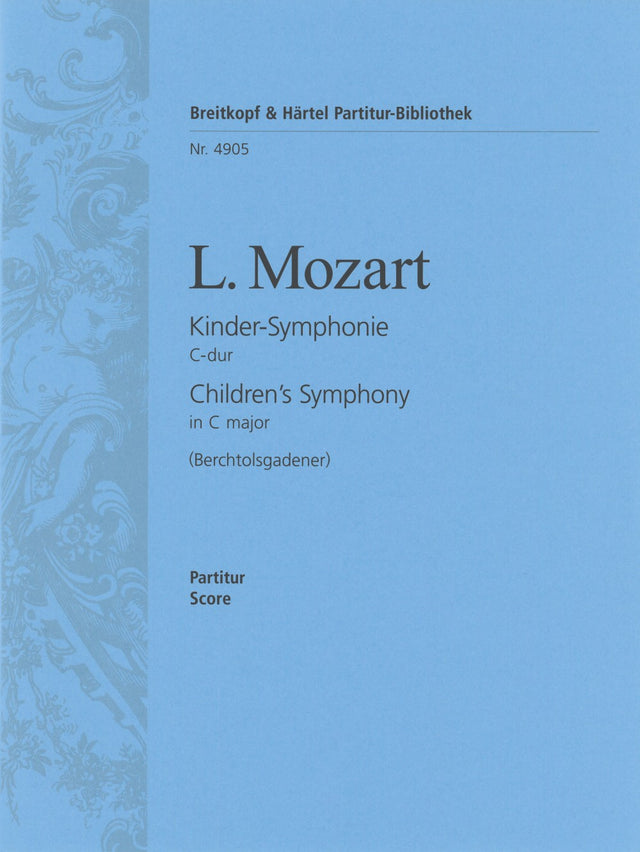 The work, originally titled Berchtolsgader-Musik, goes back to the Cassatio ex G by Leopold Mozart, whose movements 3, 4 and 7 are identical to the Kinder-Symphonie [Children's Symphony]. for a long time, the authorship of the work was uncertain. It was attributed to Joseph Haydn and his brother Michael, at times also to Edmund Angerer and Leopold Mozart's pupil Johann Rainprechter. The work probably first received the designation "Kinder-Symphonie" in 1813 through an edition by the music publisher Hofmeister. In the Children's Symphony, a cuckoo, a quail and other unusual instruments are used in addition to the usual orchestral scoring. These belong to the Berchtesgaden instruments: flutes, whistles and rattles carved from wood, manufactured in the Berchtesgaden region and widely used as children's toys throughout the country. Today, these instruments can also be replaced by flutes, whistles as well as ratchets, rattles or bell trees.