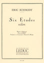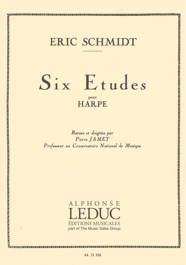 "Six Studiesis a set of six studies for Pedal Harps by Eric Schmidt. Reviewed and edited by Pierre Jamet, a French Professor at the Paris Conservatoire, this set would be ideal for an upper intermediate level and above. Most studies are two pages long and enable the player to work on different technical aspects: I. Allegro (3/4, tempo 120) II. Vivace (4/4, tempo 132) It focuses finger flexibility with a set: 4-1-3-1-2-1-3-1-4 for the right hand III. Lento (3/4, tempo 48) It focuses on arpeggios IV. Andante con moto (3/4, tempo 92) - It has the same aim as the second study but includes chords to play on 1 V. Con Bravura (6/8) This is a work on chords which has few pedal changes VI. Leggiero Volante (4/4) Longer than the other studies, it also focuses on developing fingers flexibility, and features some glissando and some pedal changes "