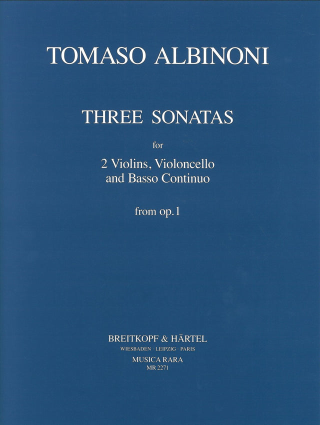 At the end of the 17th century, having a trio sonata collection printed as one's opus 1 was seen as the proper thing to do for an Italian composer. Corelli set the pace, and Tomaso Albinoni willingly joined the fray. His works of 1694 were so exciting and beautiful that they had to be reprinted several times. The occasionally independently led cello part was no doubt one of the features that made the pieces so attractive. Albinoni's opus 1 was so widely disseminated that it even made its way to Johann Sebastian Bach, who lavished all of his contrapuntal art on his arrangements of three themes from fugal movements of these pieces in his harpsichord fugues BWV 946, 950 and 951. Based on the first edition (Venice), this new edition of the first sonatas makes available once again three impressive works from Albinoni's debut opus.
