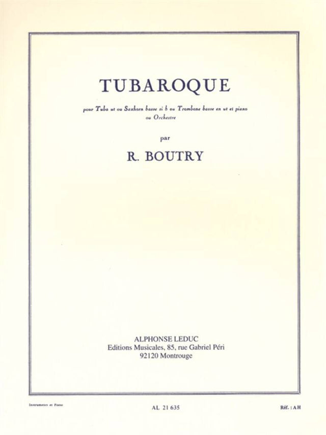 "Composed by Roger Boutry, Tubaroqueis a melodious piece of baroque music for Tuba, Bb Bass Saxhorn or Bass Trombone with Piano accompaniment. Quite difficult, it would be perfect for advanced players and would work well in a concert. Starting with a small introduction in three measures, the first part of the piece begins on a ""Slow Waltz movement"" which consists of a main theme with two variations, including one played an octave lower. The second part ""Allegretto"" is more lyrical and the last one ""Moderato/Allegro"", starts like a march to then go back to a more melodious finale. Roger Boutry is a French musician and contemporary composer who received eight First Prizes at the Conservatoire, including composition, conducting and Piano. He also won the Grand Prix de Rome in 1954 and some prizes by the SACEM and by the city of Paris. He also got involved as a professor of Harmony and director of Orchestras."