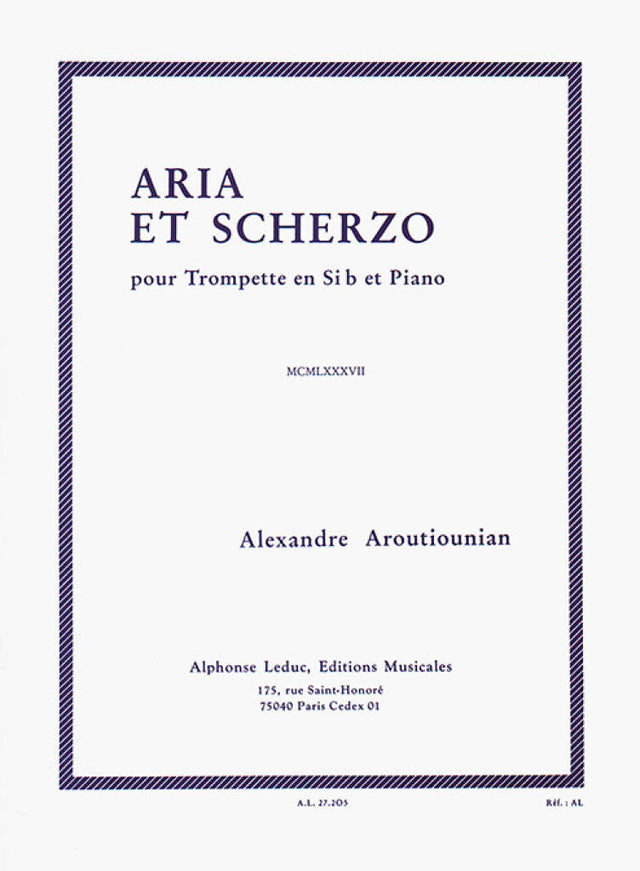 Armenian composer and pianist, Alexandre Aroutiounian (1920-2012) was awarded many prizes for his compositions throughout his career. His Aria and Scherzo for Trumpet and Piano is little-known, yet it is a sublime addition to the modern repertoire. Aroutiounian's works have been performed all over the world and he is particularly remembered for his Trumpet Concerto. Melodic and rhythmic characteristics of Armenian music are prominent in Aroutiounian's works, further expressing his nationality by use of ashughner (folk minstrel) improvisations. Aria and Scherzo is made up of two movements, the Aria marked as adagio and the Scherzo as allegretto. Tonality is exploited throughout and contains unique uses of rhythm and ensemble. Aroutiounian's Aria and Scherzo is an exciting piece for all advanced trumpeters.