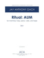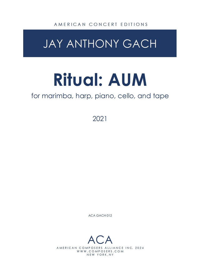 This composition is a ritual on the syllable AUM (or OM) with the heterophonic participation of the cello, marimba, harp and piano. A pre-recorded synthesized vocal "om drone" (down-loadable mp3 sound file) is cued at the beginning of the piece and continues until its conclusion - shortly after the instrumentalists have finished. It is always heard softly in the background.