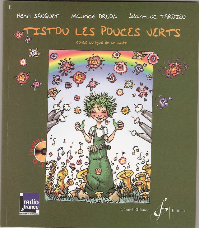 One act lyrical tale for soloist, choir of children and instrumental ensemble. Libretto by Jean-Luc Tardieu from Maurice Druon's tale. Music by Henri Sauguet. Illustration by Roland Sabatier. Once upon a time... Tistou falling asleep during school, does his education at "the school of life". A gardening lesson reveals that he has the "green thumbs" : ... from them seeds bloom instantly. in others lessons of order, poverty and sickness, he uses his gift to the hospital, the jail and he transforms his town into Mirepoil-les-fleurs. Shocked by the war between the "Vas-y" and the "Va-t'en" (fighting for a piece of oil desert because "oil is essential to the war"), he uses his thumbs' power war will cease when the canons launch flowers. CD included.