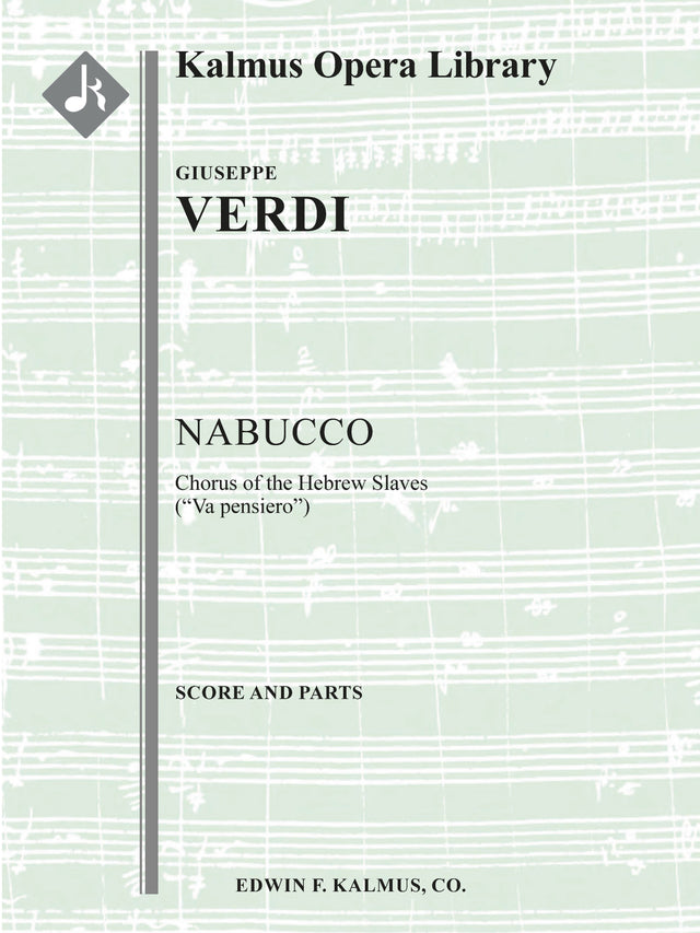 NABUCCO is the four-act Italian-language opera by Giuseppe Verdi that permanently established Verdi's reputation as a composer. The opera, borrowed from the Bible, follows the plight of the Jews as they are violently conquered and exiled from the their homeland by the Babylonian king Nabucco, This story serves as a backdrop for the main romantic and political plot of the story. The work best known from the opera is the "Chorus of the Hebrew Slaves," or "Va, pensiero, sull'ali dorate" / "Fly, thought, on golden wings," a chorus that frequently receives encores in contemporary performances. Sung at the end of the Act 3, the text of the chorus presents the Israelites as longing for their homeland after they've all been sentenced to execution. The choral score is available separately from the publisher.