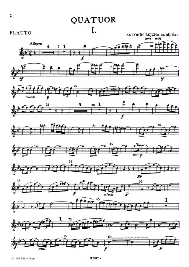 Antonín Josef Rejcha (1770–1836), the prominent Czech composer and music theorist, lived in emigration, especially in Paris, where he excelled primarily as a music teacher. As a composer, he was remarkably prolific; his compositions are mostly written in the style of Viennese Classicism, but in their formal structure and the colourful timbre of their instrumentation they show certain distinctive features that were the domain of Romanticism. The current edition contains the parts to the following quartets:, Op. 98, No. 1 in G Minor, Op. 98, No. 2 in C Major, Op. 98, No. 3 in G Major.